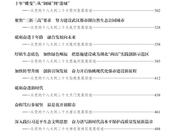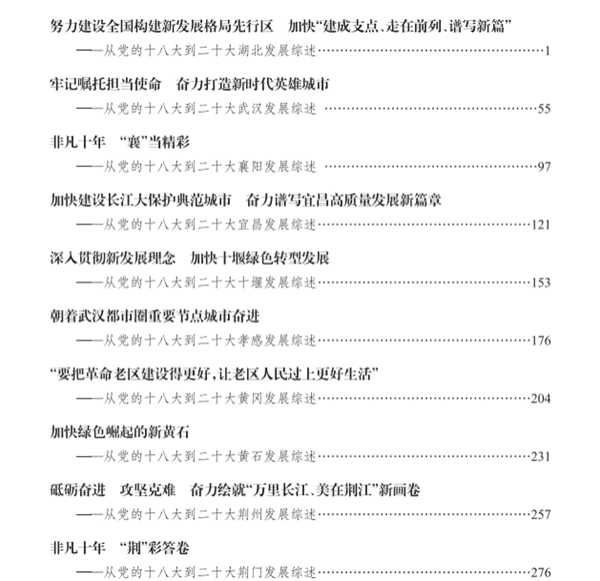 該書包含湖北省級發展綜述1篇,全省各地市發展綜述17篇,共計67余萬字,從經濟建設、政治建設、文化建設、社會建設、生態文明建設、全面從嚴治黨、地方特色工作等方面,全方位、多視角展現湖北各地新時代十年取得的新發展新成就。該書凝聚了全省黨史和文獻工作者的心血,具有較強的政治性、時代性、資料性和可讀性,既是新時代十年湖北黨史研究的階段性成果,為進一步深入開展新時代黨史研究和著作編寫積累了資料,也為推動黨史學習教育常態化長效化提供了生動教材。