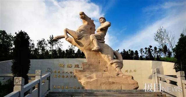 一匹白馬前蹄騰空縱身而起,馬背上的將領神情堅定,凝視前方。這座高13.5米的騎馬花崗石雕像,雖歷經多年風吹雨打,但仍不失沙場點兵的豪邁氣勢,矗立在大悟縣新城鎮嚴河村的一處紀念館內。