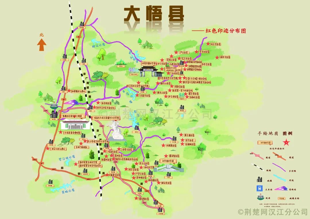 該地圖涵蓋了中原突圍紀念館、鄂豫邊區革命烈士陵園、新四軍第五師紀念館以及徐海東故居等多個時間段在大悟所發生的或遺留的紅色革命歷史遺址遺跡等紀念設施。