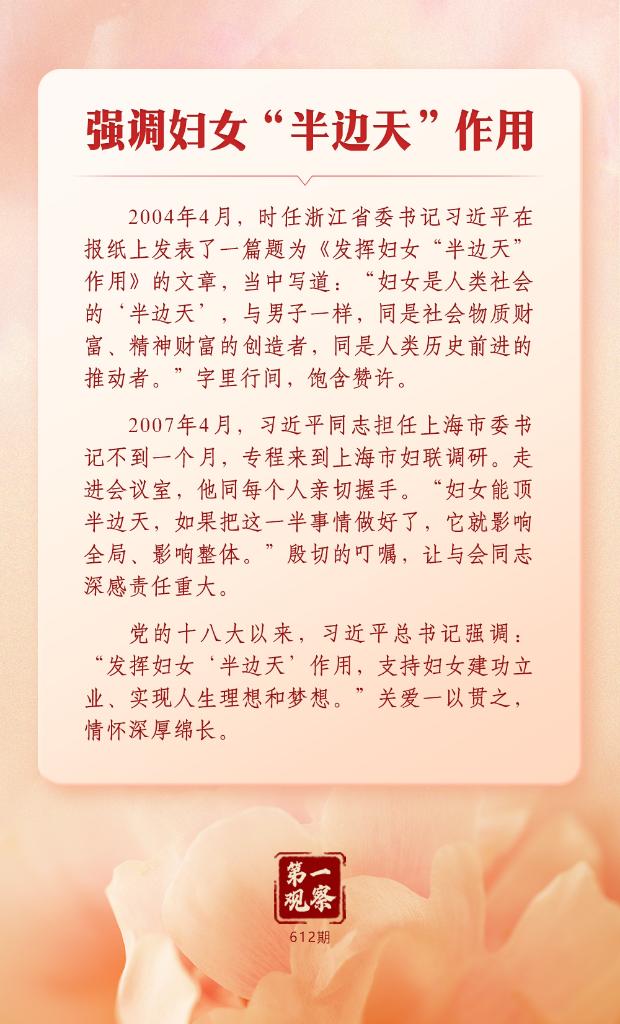 習(xí)近平總書記始終心系婦女事業(yè)發(fā)展。在全球婦女峰會(huì)即將召開之際,讓我們一道深刻體悟這份一以貫之的牽掛與重視。