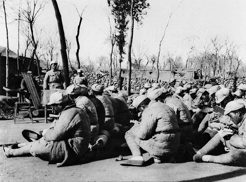 1938年,毛澤東同志在延安抗日軍政大學回答“在抗大應當學習什么”時指出,“首先是學一個政治方向”。1939年在紀念抗大成立三周年時,毛澤東同志更是明確將“堅定正確的政治方向”確定為抗大首要的教育方針。圖為在艱苦卓絕的環境中,抗大學員堅持學習�!督夥跑姰媹蟆焚Y料室供圖