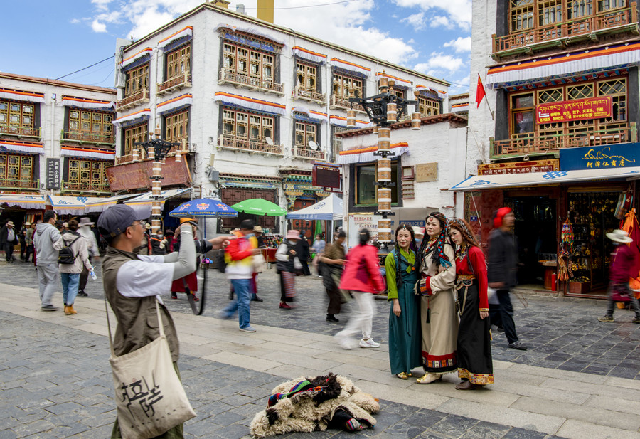 游客身著藏裝在拉薩八廓街拍照留念(2023年6月13日攝)。新華社記者姜帆攝
