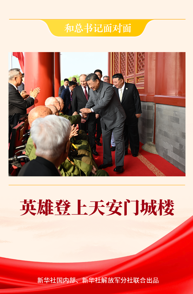 紀念中國人民抗日戰爭暨世界反法西斯戰爭勝利80周年大會開始前,習近平總書記登上城樓,走到抗戰老戰士老同志面前俯下身來,雙手緊緊握住他們的手,目光深情而溫暖。