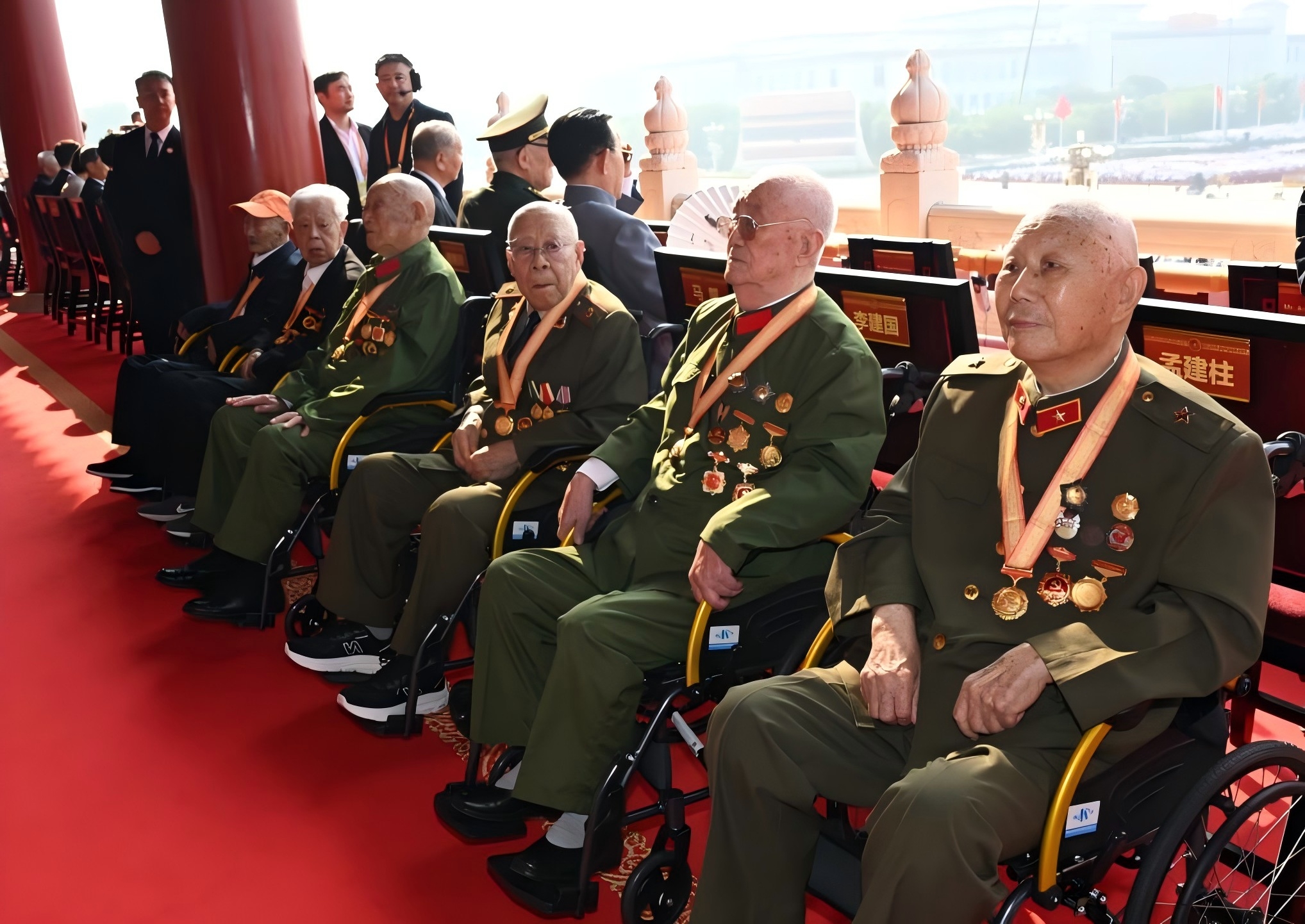 9月3日,首都北京,天安門城樓上,六名從烽火硝煙中走來的抗戰老戰士老同志受邀觀禮。