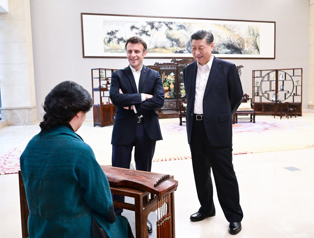 2023年4月7日,國家主席習(xí)近平在廣東省廣州市松園同法國總統(tǒng)馬克龍舉行非正式會(huì)晤。這是兩國元首在白云廳欣賞古琴演奏。新華社記者岳月偉攝