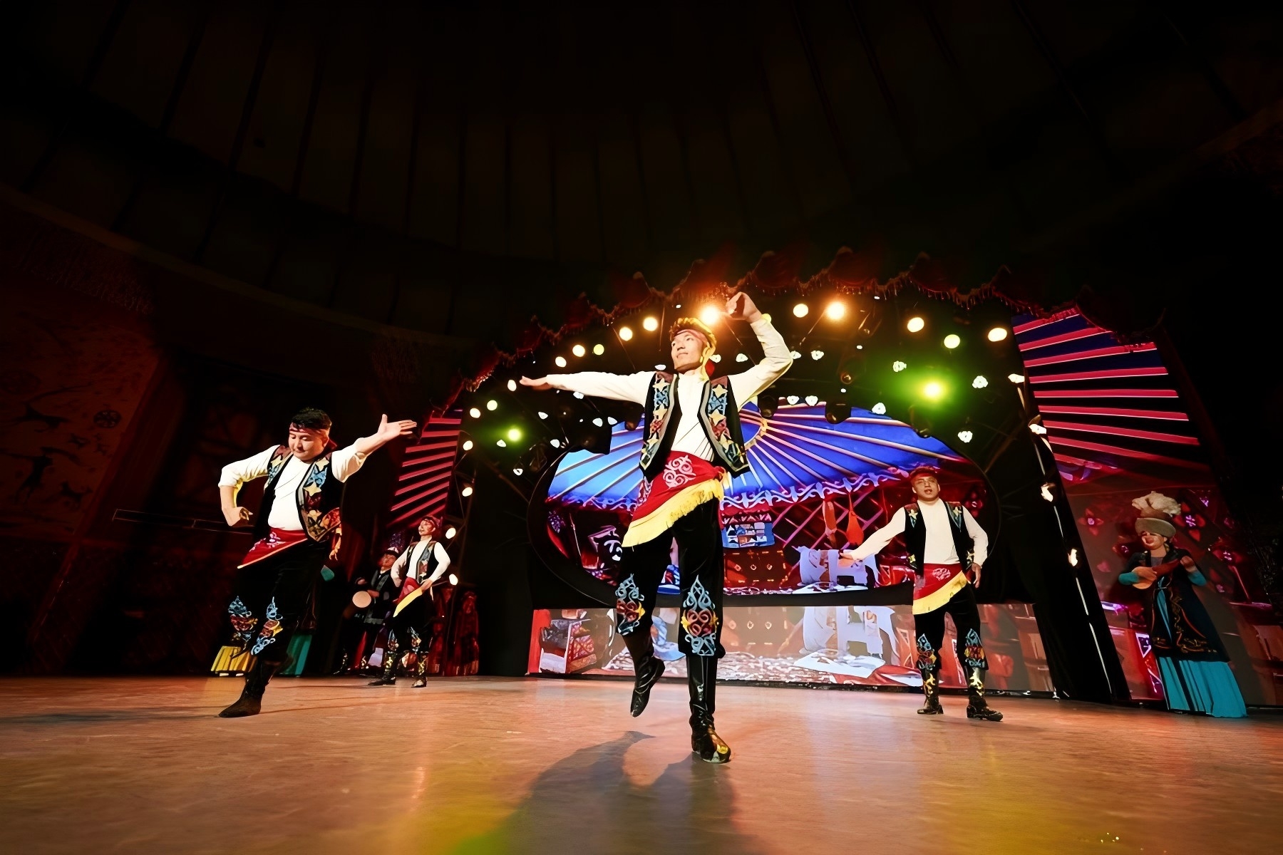 演員在位于新疆阿圖什市的瑪納斯史詩大劇院為游客演繹《瑪納斯》(2025年4月22日攝)。新華社記者徐宏巖攝