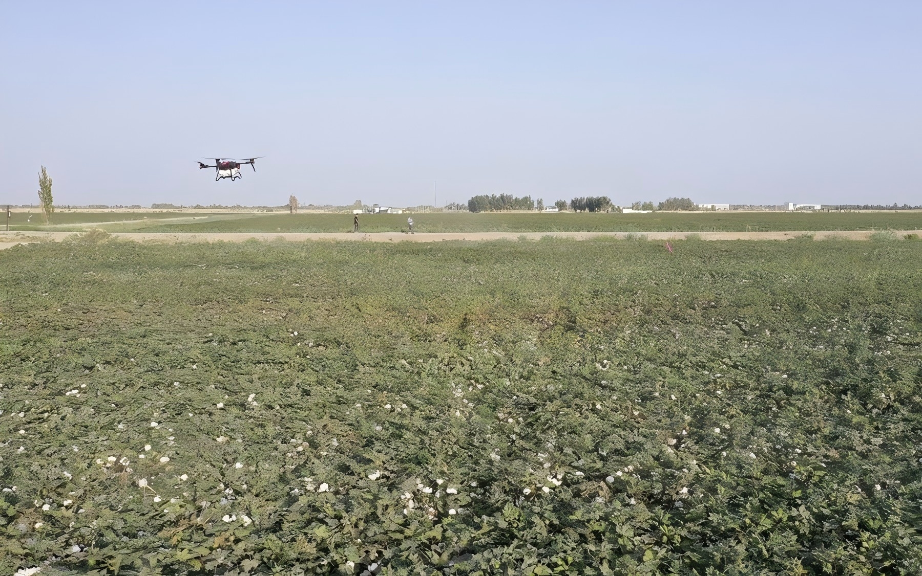 在新疆尉犁縣興平鎮(zhèn)達西村一處高標準農田,種植戶用無人機噴灑脫葉劑(2022年9月20日攝,無人機照片)。新華社發(fā)(汪志鵬攝)